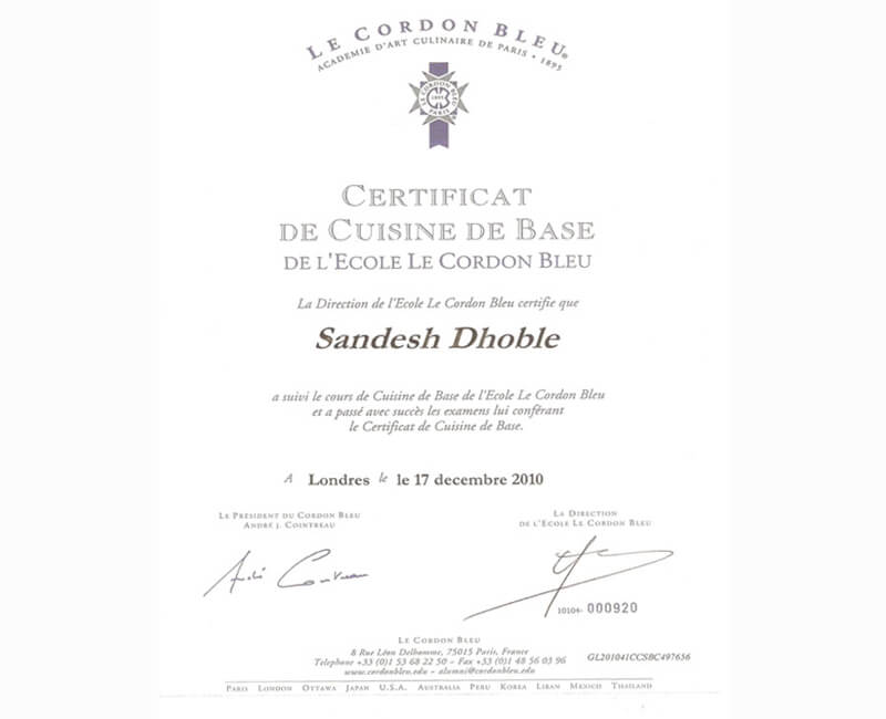 Caterers, Mumbai. He completed a course from Le cordon bleu, London, one of the famous culinary institutes. The course was about pastry and cuisine. His interests include reading, cricket (that's a given for most Indians!!), cinema